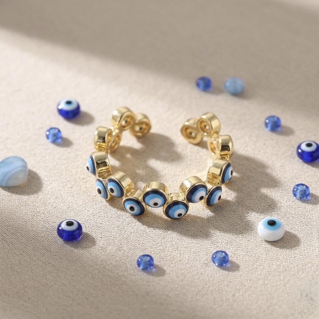 This delicate ring features a classic blue evil eye motif, designed to add both charm and symbolism to your everyday style.