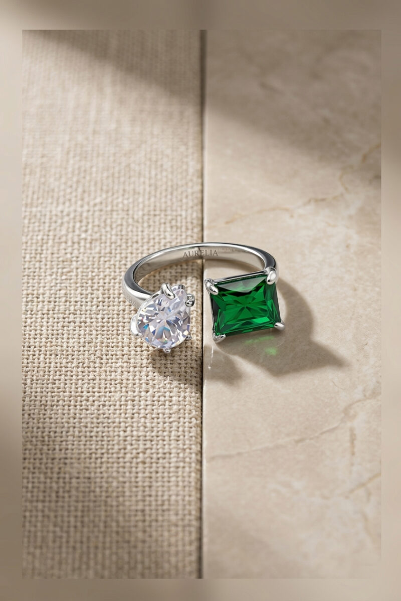 The Dual Gemstone Open Statement Ring features a bold modern silhouette with two contrasting stones placed on an elegant open band. The design balances contemporary style with sophistication, making it the perfect statement piece for both casual outfits and evening looks. Its unique structure ensures the ring stands out while remaining comfortable for daily wear.