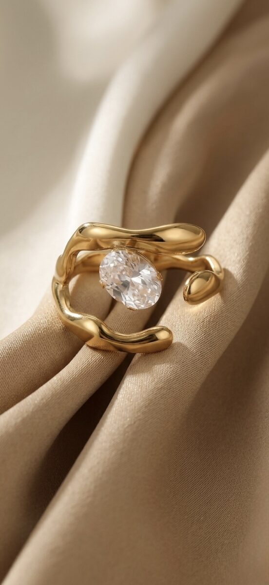 This elegant ring features a delicate crystal setting paired with a sleek gold finish, creating a look that feels both modern and timeless.