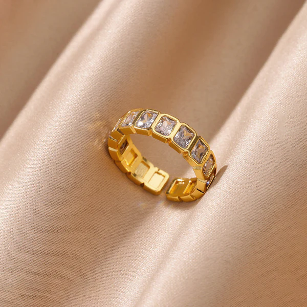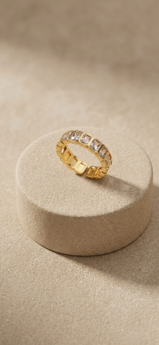 Elegant gold eternity band ring with emerald-cut crystals. Perfect for stacking and everyday wear.